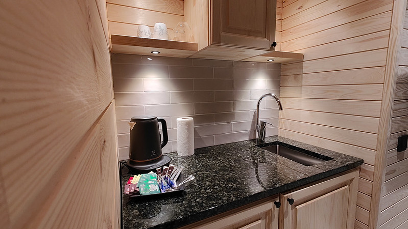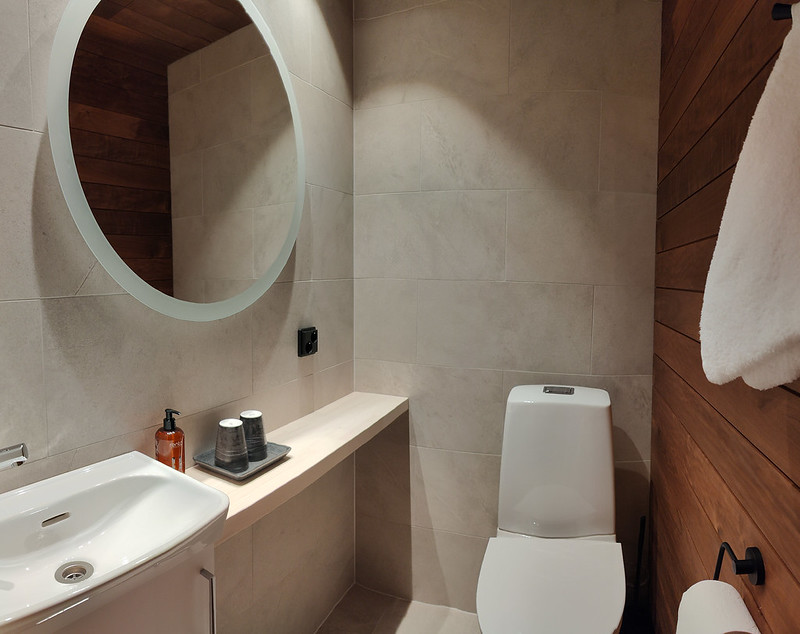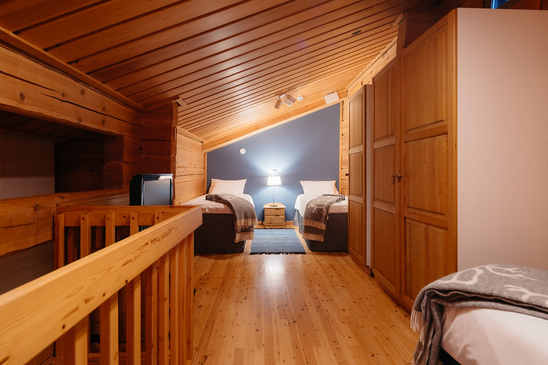 The total floor area of 47 m2 is divided into two levels. Downstairs you will find a cozy living room with a sofa bed, an integrated kitchenette with a wine cabinet, coffee & water kettles, and a separate toilet and shower area. In the upstairs loft there are comfortable beds for two and wonderful views from the two-story glass wall facing northeast, perfect for viewing the northern lights.